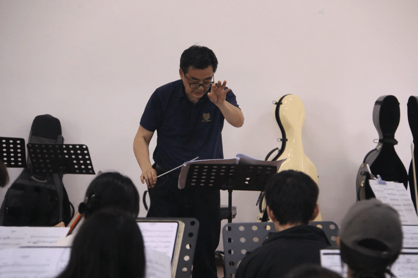 周进教授针对乐曲的节奏把控、声部配合、情感表达及演奏技巧等问题作出了细致点评与示范,分别梳理了管弦乐团的声部层次与平衡,并立足作品的文化内涵,从音色搭配、力度变化、传统韵律等方面逐一指导。