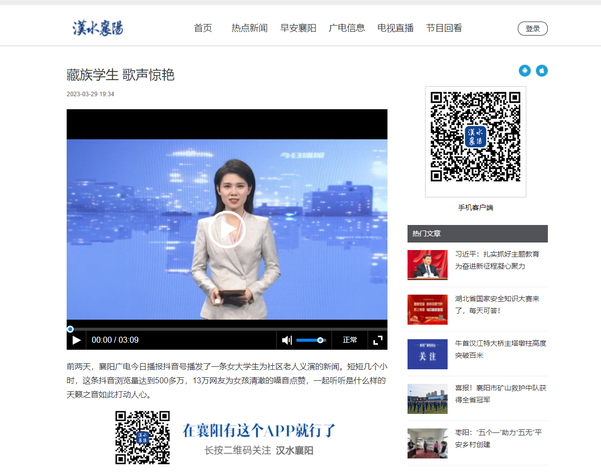 (通讯员 廖星铭)3月下旬,来自西藏的音乐学2213班平措曲珍同学参与雷锋月社区志愿服务活动时,为社区老人义演的片段被襄阳电视台今日播报抖音号报道,目前,浏览量已达到500多万,以下是今日播报详细报道截图。